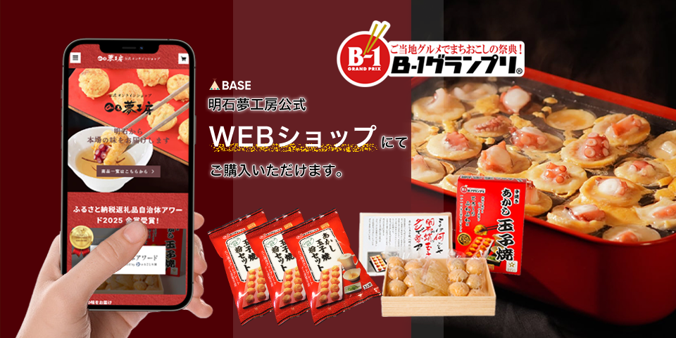 弊社では、『あかし玉子焼(明石焼き)』などを他府県へ出張実演販売や全国各地の皆様に当店こだわりの『あかし玉子焼(明石焼き)』を召し上がっていただけるWEBショップもご用意しております。